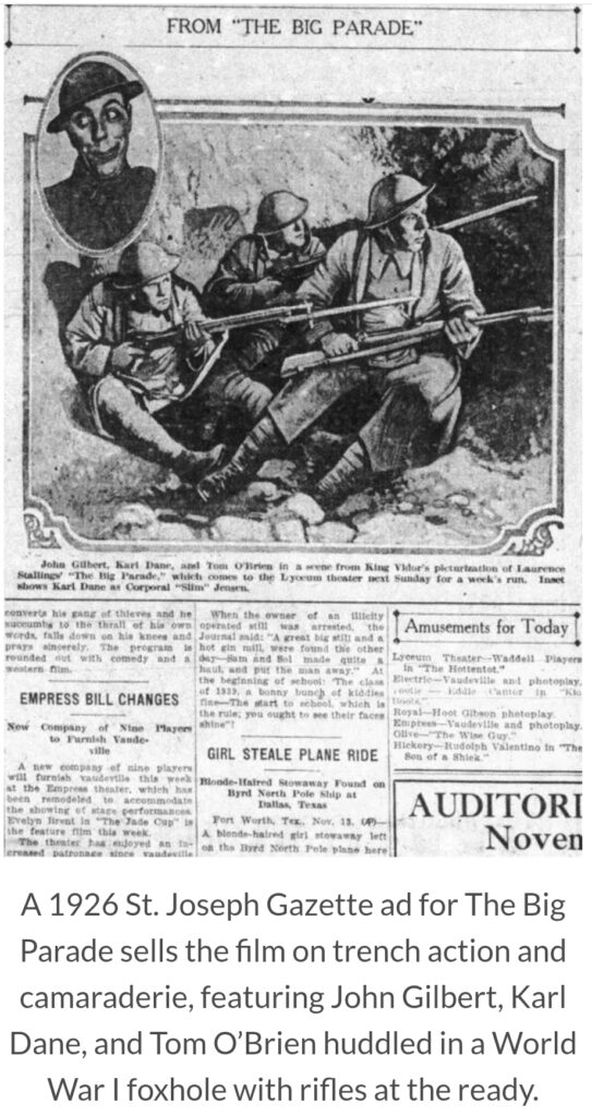 When The Big Parade premiered in 1925, it wasn’t treated like an ordinary movie. It became a national event. Millions of Americans went to see it, including World War I veterans who were still struggling to make sense of life after combat. Newspapers across the country gave it front-page attention, recognizing that this film was doing something rare: showing war and its aftermath without filters or easy heroics.