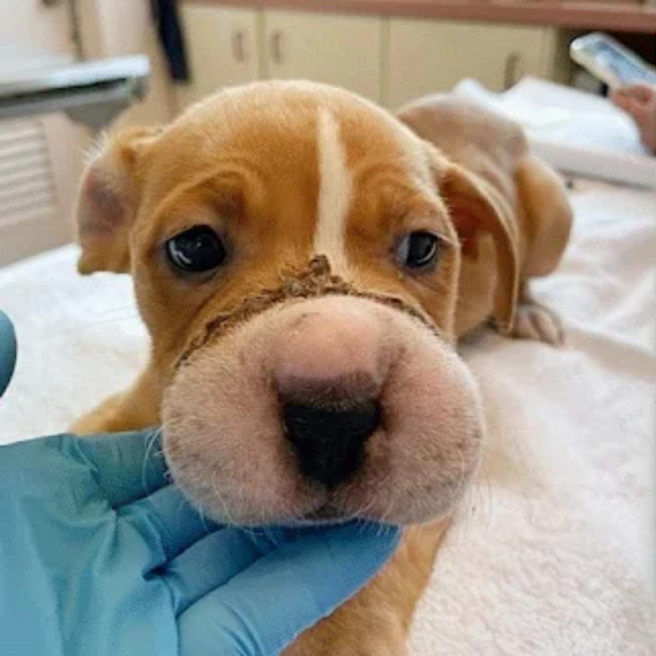 A young puppy was discovered with severe injuries after someone tied a hairband around her muzzle so tightly it cut into her skin, reaching the bone.