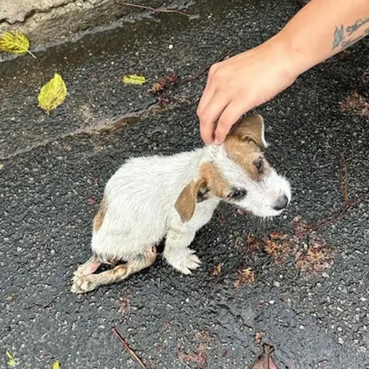 A tiny puppy, not yet two months old, was found abandoned on a street in a very fragile condition. This little dog had endured broken legs and a damaged spine, leaving him unable to move on his own.