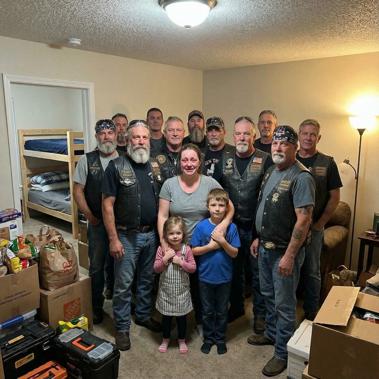 I was standing in my doorway at 7 a.m. on a Tuesday, clutching my four-year-old daughter while my seven-year-old son hid behind my legs, when thirty massive bikers in leather vests started climbing the apartment stairs.