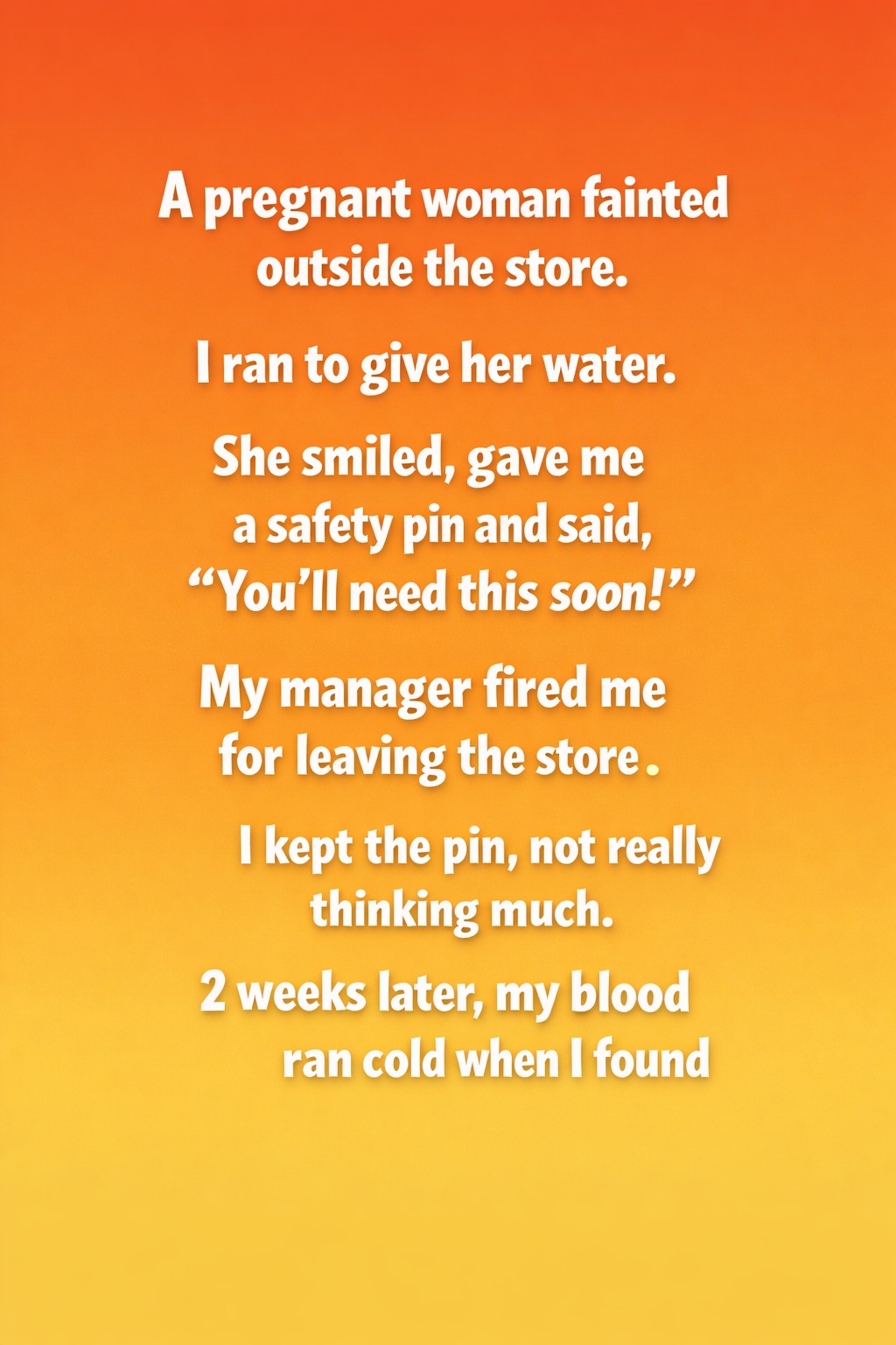 That day started like any other shift, routine and predictable, until a single moment changed everything. I was midway through my work when I noticed a pregnant woman collapse just outside the store entrance. Without thinking twice, I rushed to her side, helped her sit up, and offered water while making sure she was breathing comfortably. The situation was tense, but she remained calm, even smiling once she recovered. Before walking away, she pressed a small safety pin into my hand and said quietly, “You’ll need this soon.” I didn’t understand her words, but the encounter stayed with me long after she disappeared from view.