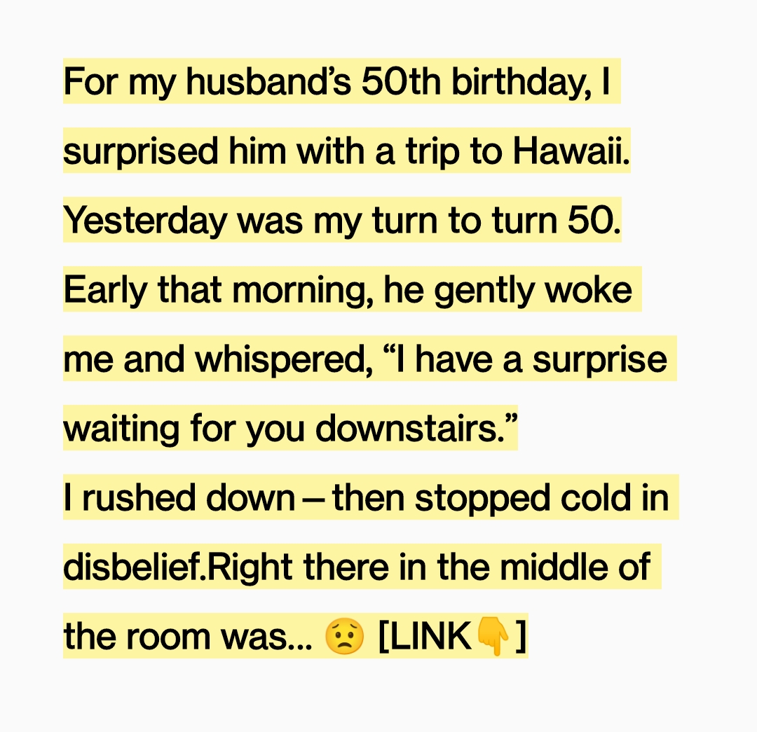 I thought I knew what to expect when my fiftieth birthday arrived. After all, I had spent months planning my husband’s own milestone, carefully arranging a trip to Hawaii so the ocean could speak for everything we’d built together over the years. When my turn came, I imagined something quiet and familiar—maybe a warm breakfast or a simple note. Instead, before the sun had fully risen, he gently woke me with a grin and hinted at a surprise waiting downstairs. Still half asleep, I followed him, assuming candles and coffee were all that awaited me.