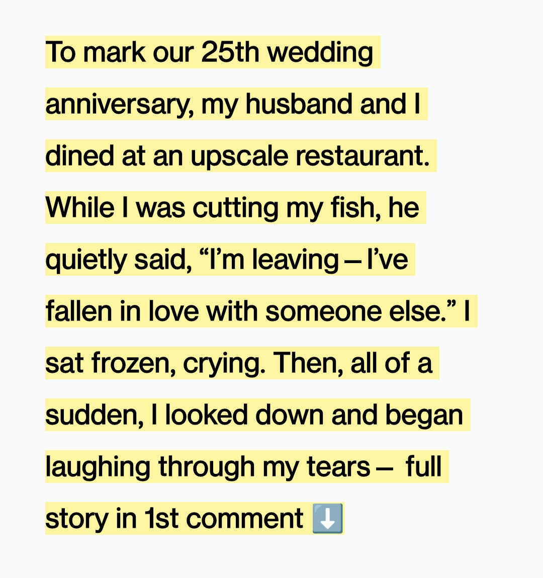 That certainty shattered in a single sentence. Without warning, David looked at me and calmly said he was leaving. The words felt unreal, as if they belonged to another table, another couple. The room kept moving—glasses clinked, people laughed—while my chest tightened and the world narrowed to his face. He spoke of someone else, of feeling “alive,” and every memory we shared suddenly felt fragile. Tears came before I could stop them, falling onto a table set for celebration that now felt painfully misplaced.