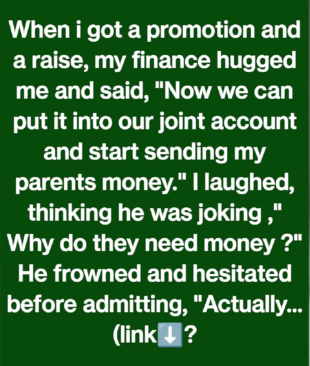 When I got a promotion and a raise, my fiancé hugged me and said, “Now we can put it into our joint account and start sending my parents money.” I laughed, thinking he was joking, “Why do they need money?” He frowned and hesitated before admitting, “Actually… they’ve been struggling for a while. I’ve been sending them part of my salary every month. I hoped you’d help once we had more.”