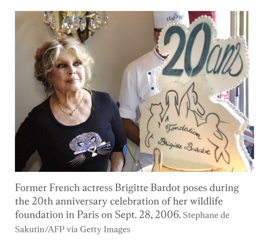 “A true pioneer, at the age of 39 she gave up the limelight and the world of entertainment to dedicate her fame and unwavering determination to the service of animals and the most vulnerable, such as the elderly,” a translation of her foundation’s Instagram post on Dec. 28 reads.