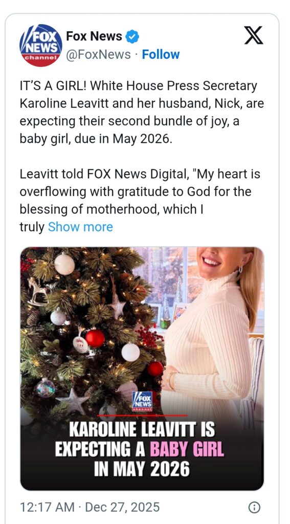 As 2026 approaches, Leavitt continues to balance her historic role with expanding her family. And while the praise for Trump has sparked debate, her holiday announcement will be remembered for more than just baby news.