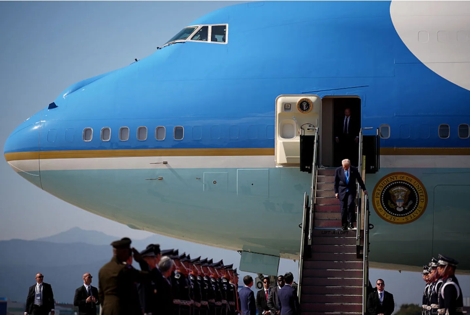 Trump gripped the railing of Air Force One as he took special care to walk down the steps after landing in Busan, South Korea, on Wednesday.