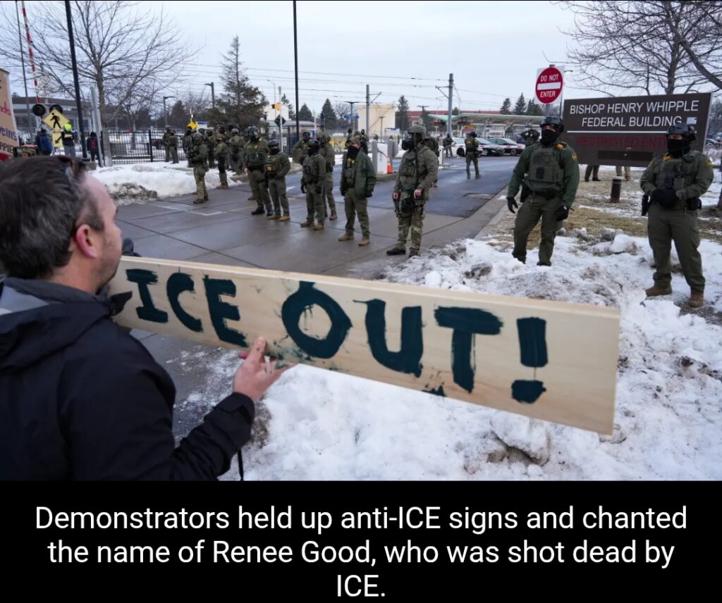 Demonstrators gathered near the Whipple Federal Building, where Immigration and Customs Enforcement maintains a regional presence. Chanting Good’s name and holding anti-ICE signs, crowds demanded accountability and called for federal agents to leave the city.