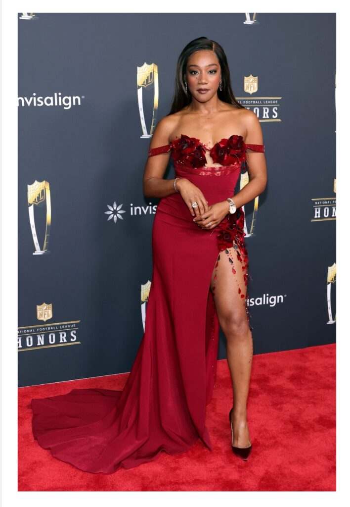 Tiffany Haddish stuns in a deep red, off-the-shoulder gown with floral detailing and a thigh-high slit, posing confidently as she joins the night’s celebrations alongside football’s biggest names.