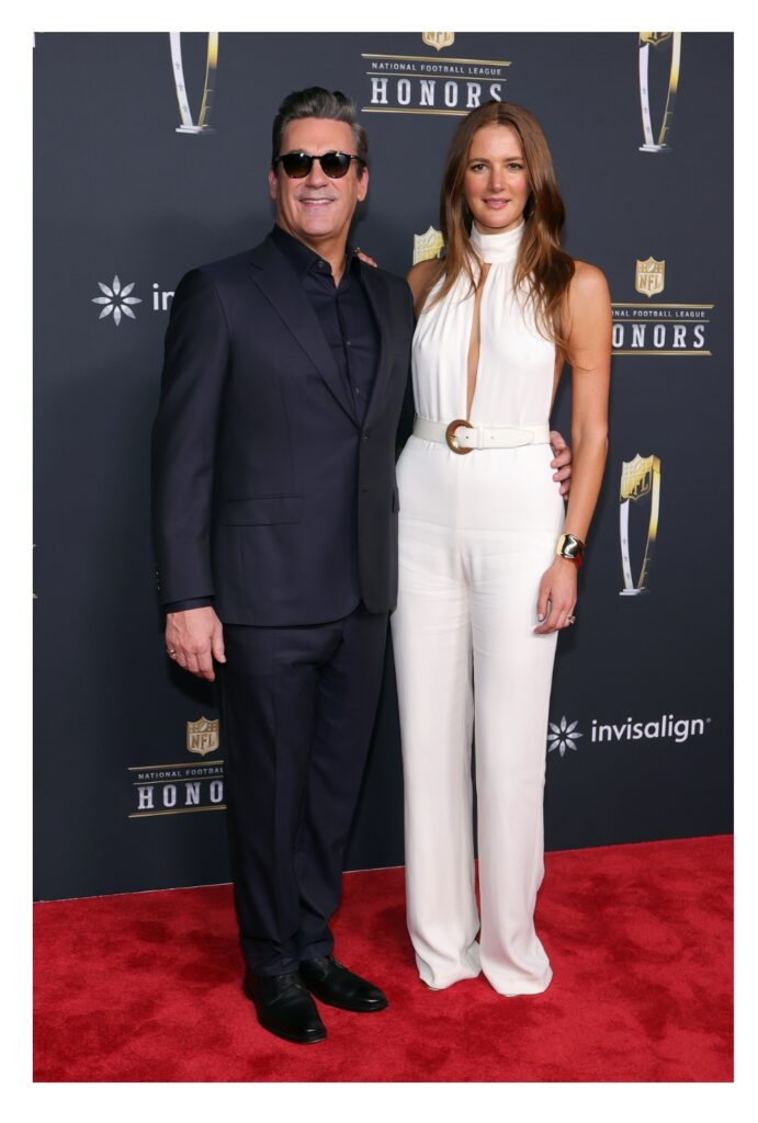 Jon Hamm and Anna Osceola pose with their arms around each other, with Jon in a dark tailored suit and Anna in a sleek white jumpsuit, presenting a polished and understated red-carpet moment.
