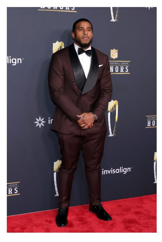 Bobby Wagner opts for a sharp burgundy tuxedo with black lapels, standing poised with hands clasped as he represents the league’s elite defensive talent.