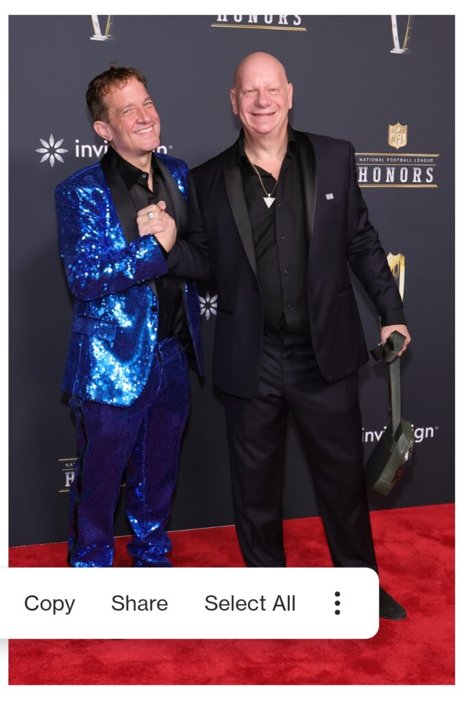 Jeffrey Beacher and Jeff Ross clasp hands and grin, with Jeffrey in a shimmering blue suit and Jeff in black, sharing a lighthearted moment amid the formal festivities.