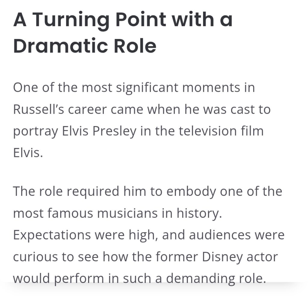 Russell delivered a performance that impressed both critics and viewers.His portrayal of Presley captured the singer’s personality and stage presence, earning widespread praise and an Emmy nomination.The performance marked a turning point in Russell’s career. It demonstrated that he was capable of handling serious dramatic material and opened the door to more complex roles.
