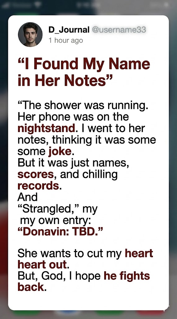 There was only one note saved, titled “Names and Ratings.” My stomach dropped as I opened it. At first I thought it was some kind of joke or weird list, but the more I read, the colder my body felt. Each name had a rating beside it, followed by chilling descriptions of how they died. Some had their throats cut. One had been strangled. Another had been decapitated. These weren’t jokes or fantasies—they were written like records. Like someone keeping score.