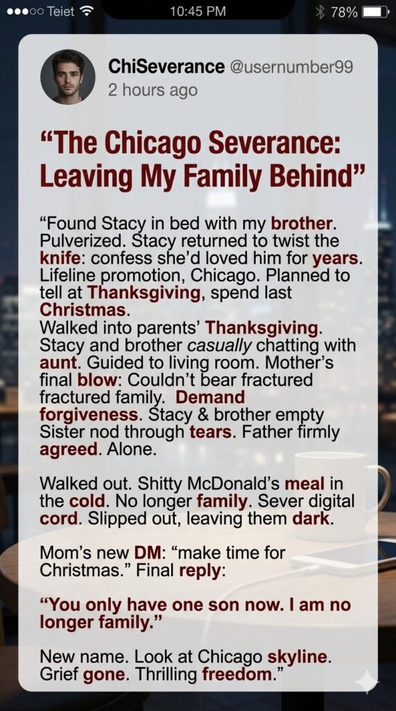 On December 15th, I quietly slipped out of Minnesota, leaving them completely in the dark. A few days before Christmas, a message managed to slip through on a brand-new Instagram account. It was my mother, pleading to know why I left and begging me to “make time for Christmas” because they loved me. I typed my final reply with steady hands: *”You only have one son now. I am no longer family.”* I blocked the account, locked down my life, and began the paperwork to change my last name. As I look out at the Chicago skyline today, the grief is finally gone, replaced by the thrilling freedom of a life entirely my own.