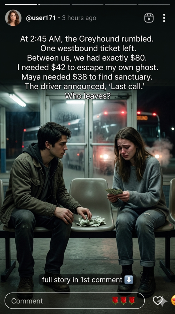 ### The Currency of Shared PainI didn’t mean to stare, but the desperate, frantic way she counted those bills drew me in. I walked over to the vending machine, fed it a dollar, and brought back two stale cups of black coffee. I held one out to her. She flinched at first, her eyes darting up to meet mine. They were exhausted, shadowed by a kind of grief I recognized instantly—the hollow look of someone who had watched their world burn to the ash. She took the cup, her fingers freezing against mine. “Thanks,” she whispered. “I’m Maya.””Leo,” I replied, sitting a seat away. “Waiting for the westbound?”She let out a breath that sounded like a dry sob. “Trying to. The ticket to Omaha is seventy-five dollars. I only have thirty-eight. I thought… I thought I had more, but the shelter took a cut for a blanket.”