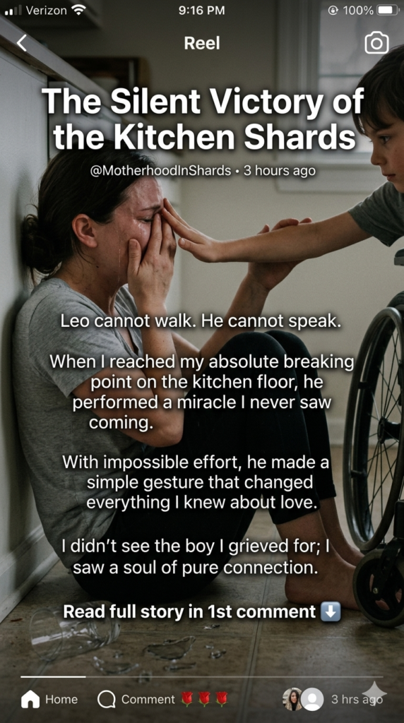 Then, I heard the squeak of his wheelchair tires. Leo had managed to maneuver himself into the kitchen. He couldn’t speak to ask me what was wrong. He couldn’t bend down to pick up the glass. His muscles, which usually fought against his own intentions, were stiff and uncooperative. But as I sat there weeping, Leo forced his arm to move. It took an agonizing amount of effort, his face contorting in concentration, but he reached down. He didn’t try to hand me anything. He simply pressed his palm flat against the side of my wet, tear-stained cheek. He let out a soft, low hum—a sound he usually reserved for when he was feeling totally relaxed and safe. He locked his deep brown eyes onto mine, and in that gaze, I heard everything he couldn’t say. *I am here. We are okay. You are enough.*