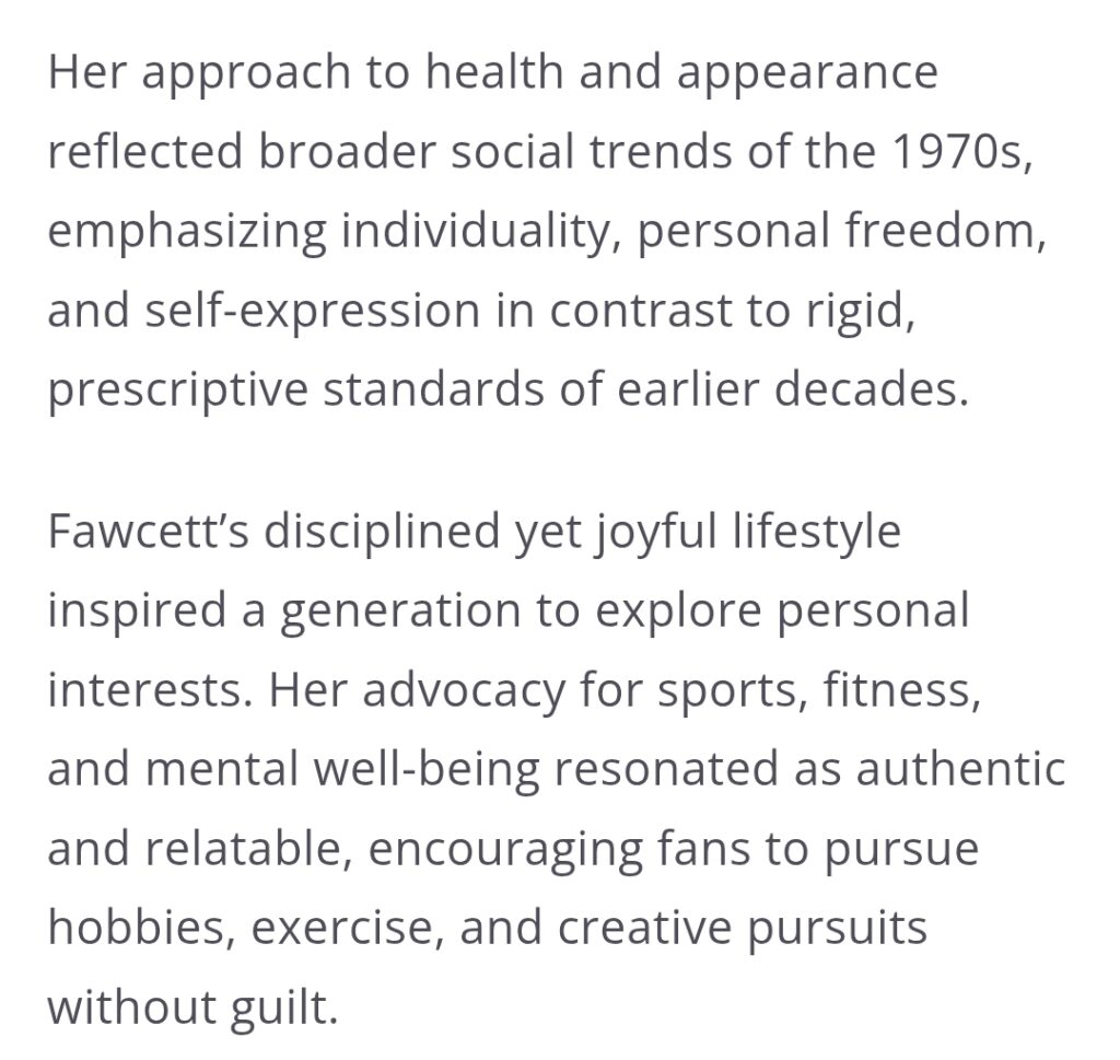 Fawcett’s influence extended beyond fitness. Her style, personal charisma, and public appearances communicated an ethos of empowerment, independence, and self-expression, reflecting broader cultural shifts of the 1970s toward female agency and visibility.