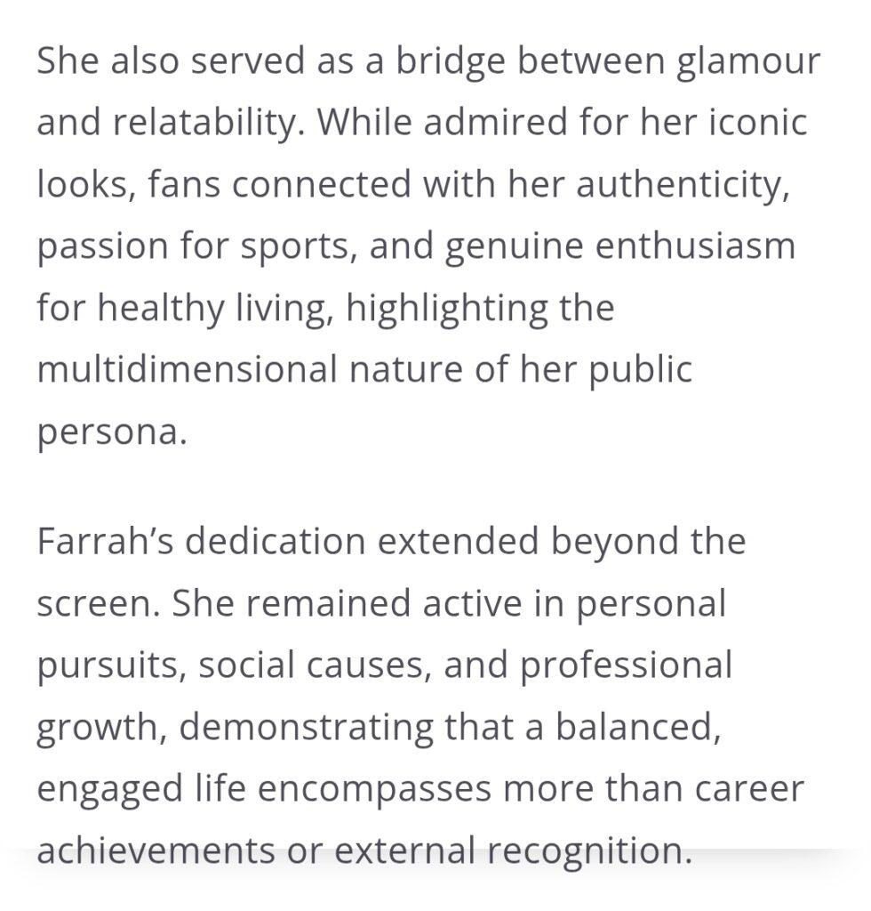 Farrah’s presence on and off the screen demonstrated that a life of activity, passion, and authenticity is compelling, influential, and deeply relatable, encouraging fans to cultivate personal interests alongside professional goals.