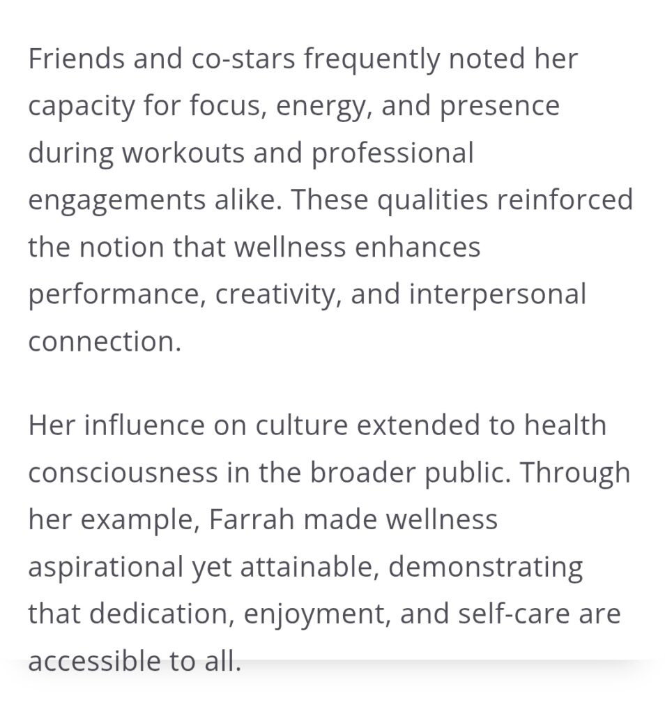 Beyond physical activity, Farrah cultivated a lifestyle centered on balance and moderation. She valued nutrition, sufficient rest, and mindful engagement with her work and personal relationships, demonstrating that holistic wellness encompasses both body and mind.
