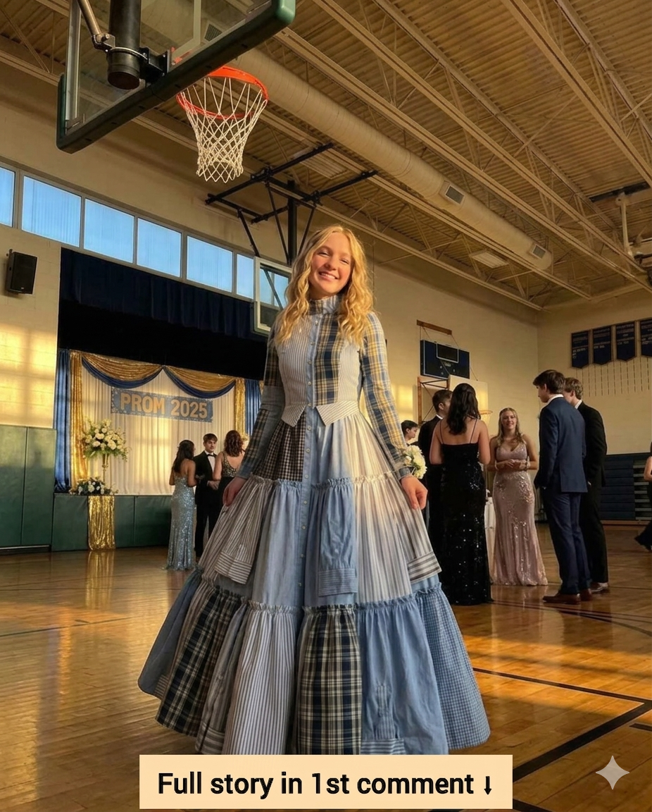 “You see a cheap dress made of work shirts,” the principal continued, his voice softening just a fraction, though it still carried to every corner of the room. “But let me tell you what I see. I see the uniform of a man who secretly paid out of his own pocket to make sure three of you in this very room had hot lunches every day when your parents lost their jobs.”A gasp rippled through the crowd.
