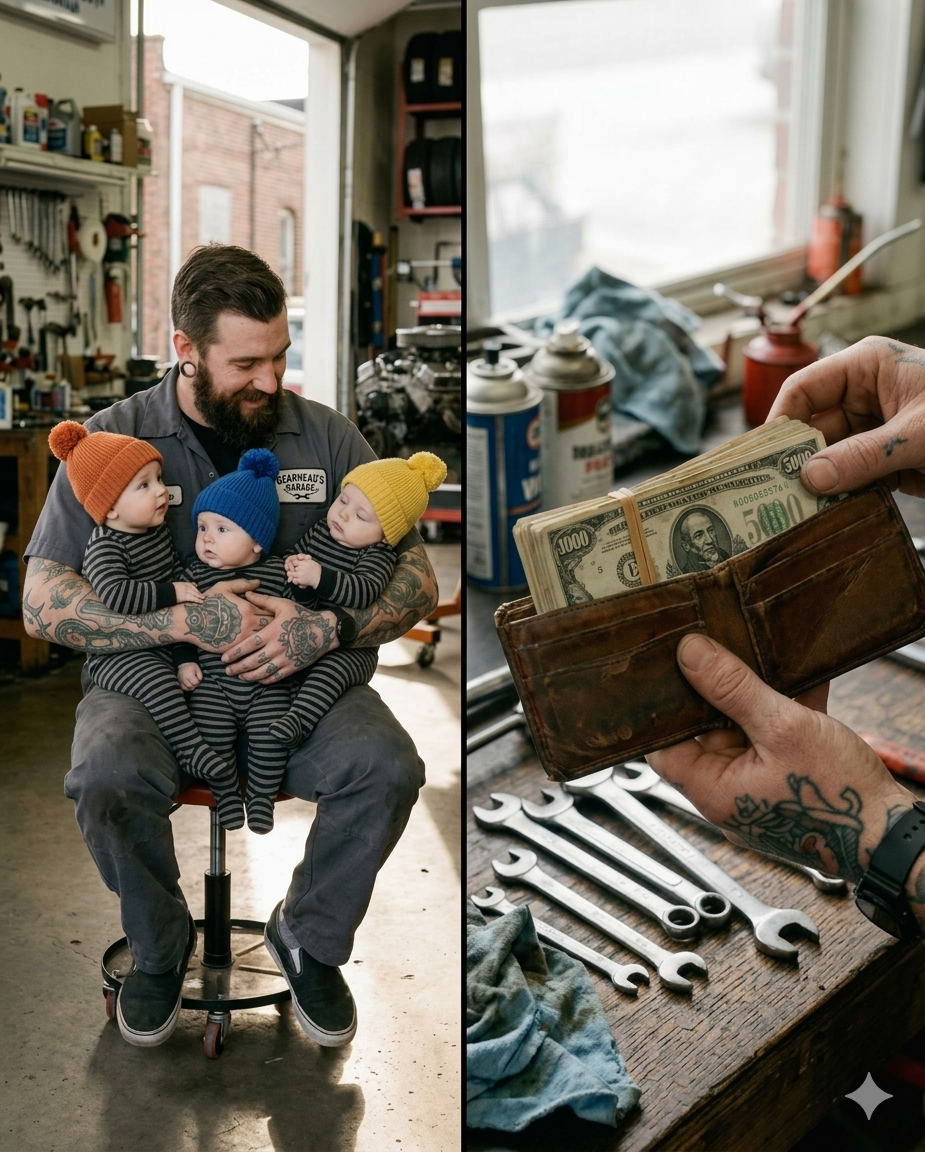 Ever since my ex-wife walked out the door complaining that motherhood was suffocating her, I had been drowning. Raising three five-year-olds entirely on my own on a mechanic’s salary felt like trying to bail water out of a sinking boat with a teaspoon. My knuckles were permanently stained with motor oil, my back constantly ached, and I spent my evenings trying to stretch cheap boxes of pasta into filling meals. I loved my kids more than breathing, but the financial terror was a shadow that never left my side.