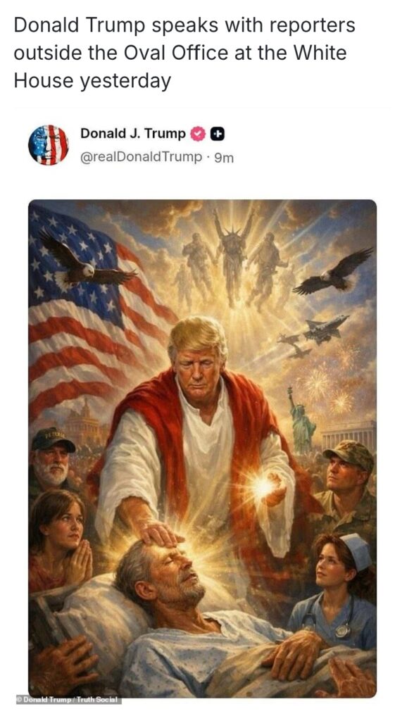 The AI-generated image showed Mr Trump as a robed Christ, curing an ill man while surrounded by adoring figures including a nurse and a soldier. Fallen US servicemen could also be seen ascending to heaven in the style of a Renaissance painting.